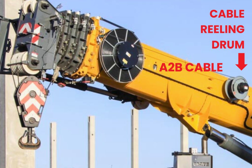 This switch sends an electrical signal through an A2B cable to a cable reeling drum on the boom’s side. The drum rolls up and pays out the cable as the boom extends or retracts.