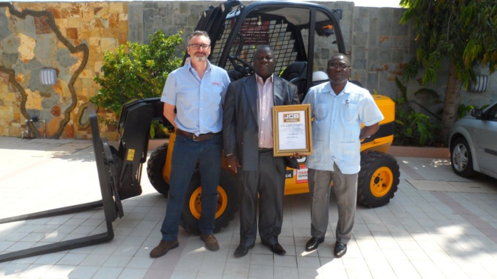 2013 – With Solomon Eshun and Seth Marthey. Thanking Seth for his contribution to the success of the JCB Teletruk in Ghana. Tema, Ghana