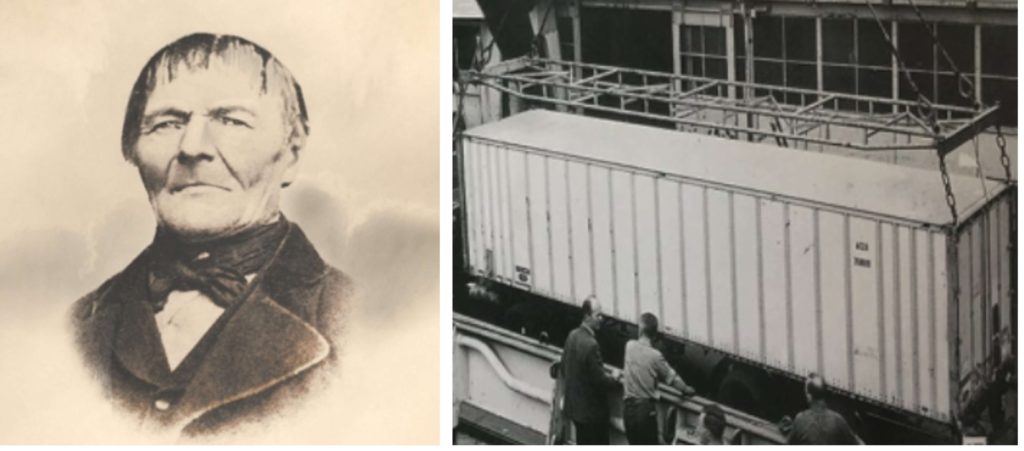 Top image shows Arie Stinis who founded his smithy, making horse shoes and skates for the community of Krimpen aan de Lek, in 1830 and in 1967 Stinis unloaded the first iron box in Rotterdam – a huge milestone.
